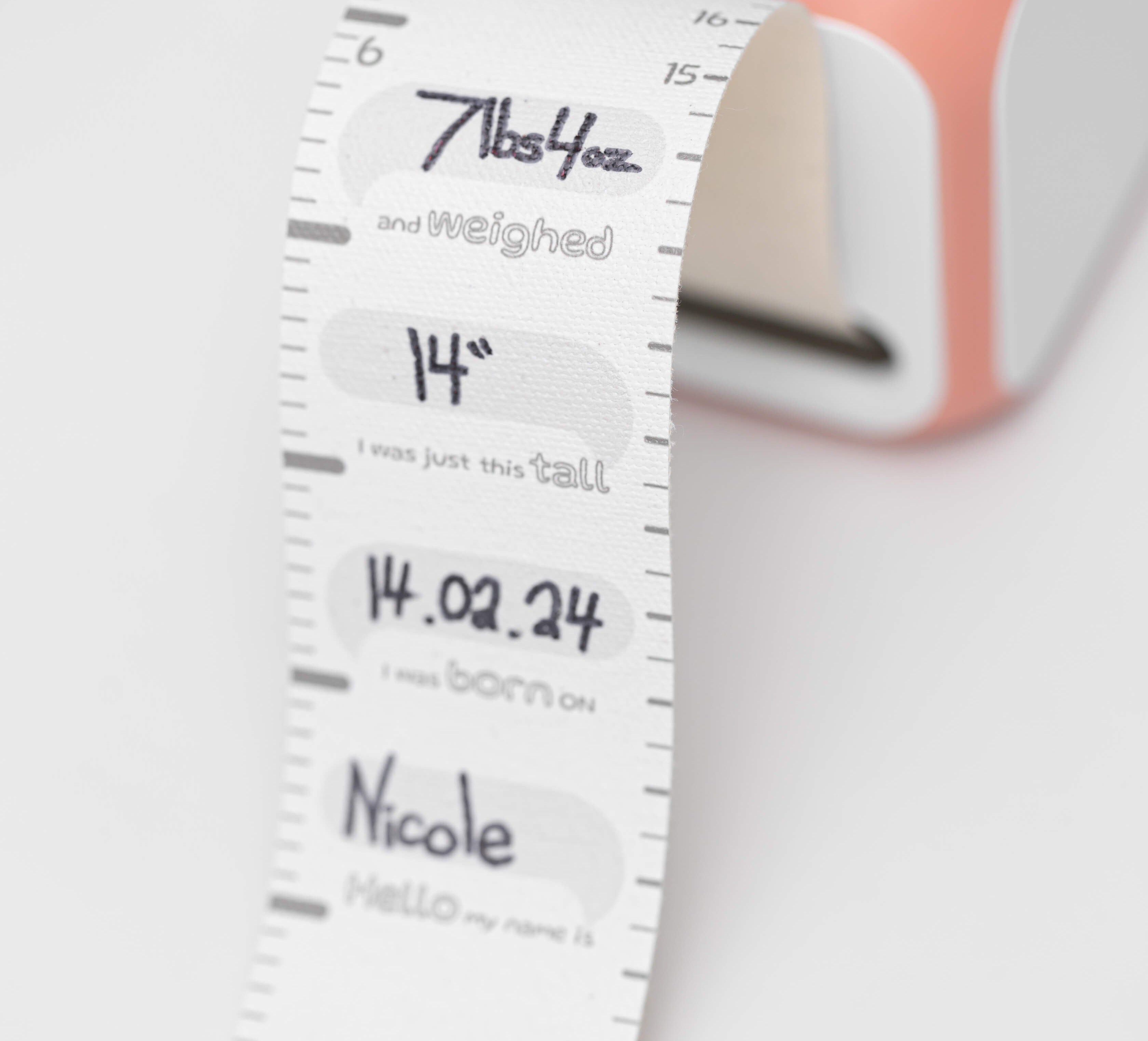 Add their name, birthdate, and baby stats right on the tape. Personalized from the very beginning.